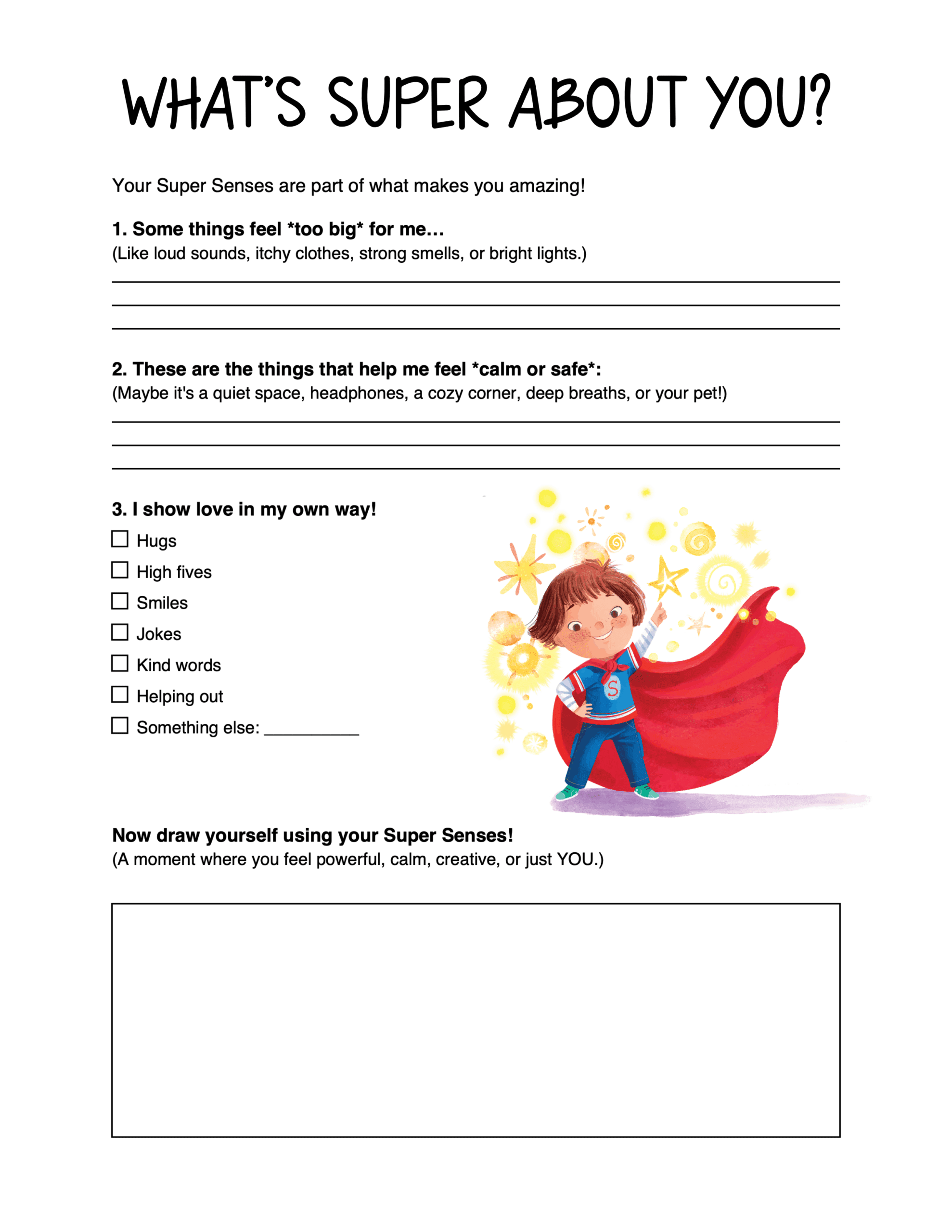 My Super Senses is a heartfelt and playful story told from the perspective of a child with heightened sensory experiences as they navigate the ups and downs of everyday life. With warmth and humor, it celebrates the strengths and challenges of sensing the world more intensely. Whether it’s loud noises, strong smells, or itchy clothes, this story helps children feel seen, understood, and proud of their Super Senses.
